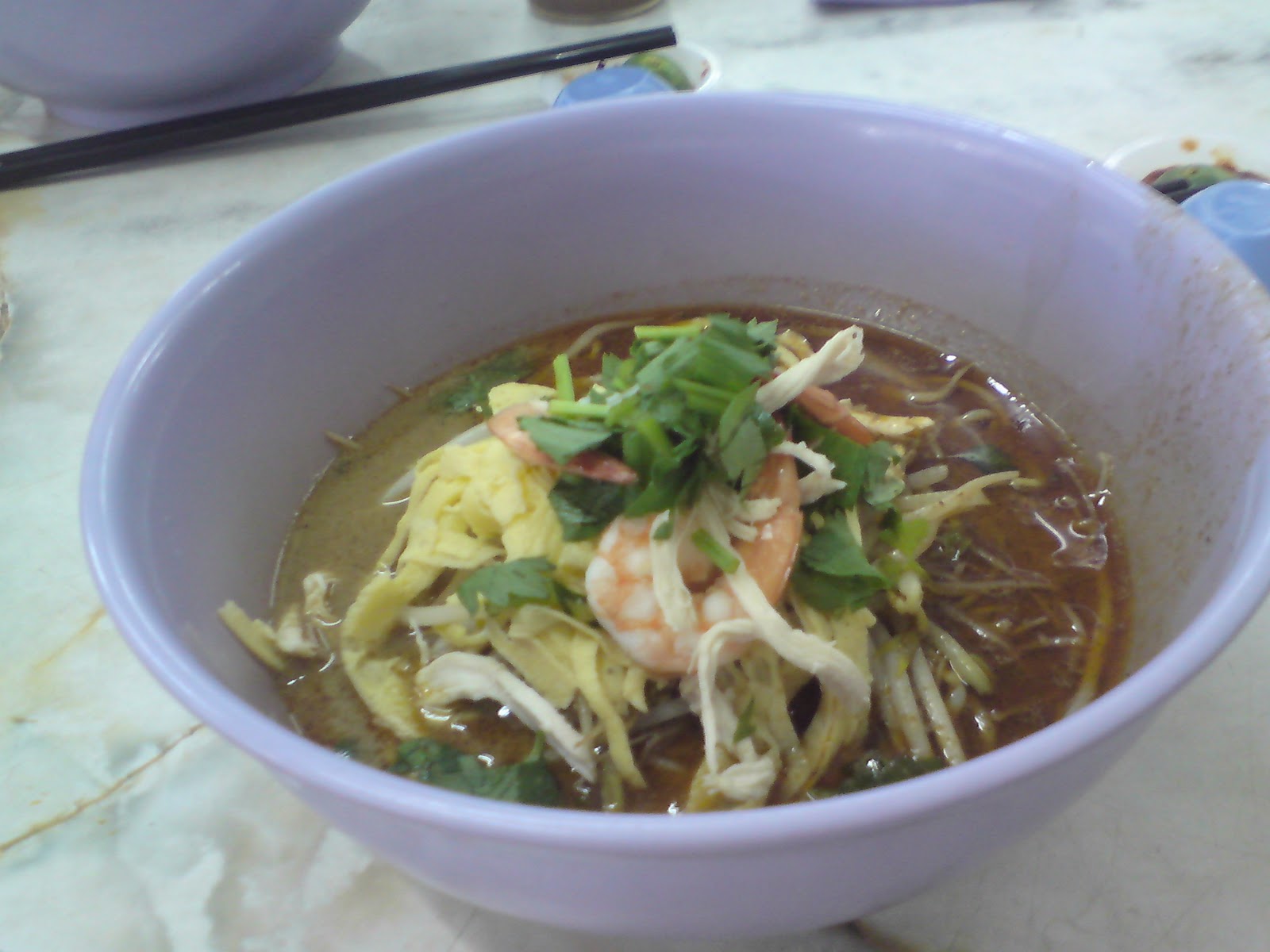 Sarawak Laksa, 顾名思义,就是 Sarawak style 的Laksa,味道跟西马的不同,有甚么不同呢 ? 呃。。,说不出那里不同,只可以说,用的材料和煮法不同吧 ! 还有,它椰浆味很浓 (当然,一些奸商下手不重,淡了些。。。),和带有少许虾酱的味道。。好吃不好吃呢,那就看各人的喜好了,我就说好吃啦。。。尤其是 Laksa 面。。。其实原来的配搭是 Laksa + 米粉(米粉要是那种粗于普通米粉但又细过濑粉的),但个人就比较喜欢 Laksa + 面,而这面呢,就一定要是 Kampua 的面,我还是不能接受搭黄面的。。。。。