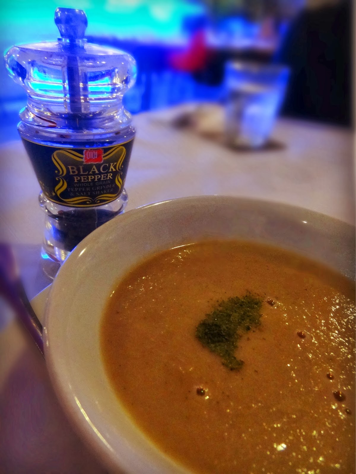 我点了一份晚餐套餐,里头包括餐汤、主食、甜点和饮料。今天给的是蘑菇浓汤,味道普普通通,可是吃得出来蘑菇下得满多的,全都溶在浓汤里了。