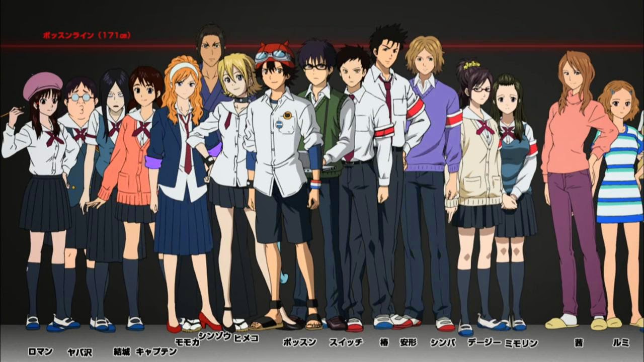它的角色设定,有除了超强定力以外没有别的特点的 bossun;爱吃怪味棒棒糖又爱挥棒打人的鬼姬 himeko;用手提电脑来讲话的禁语 switch;bossun 的双胞胎弟弟,管家仔生徒会会长 sasuke;只会用视觉系(一种音乐风格)语言沟通的 dante;一天到晚穿着武士袍的 shinzo ;吃东西速度破音速的队长 chiaki ;没责任感及常发明怪药水的 chuma sensei......等等人物,毫不含糊,和一些怎么看来看去好像多数角色都一样的主流漫画比起来,真的好很多。