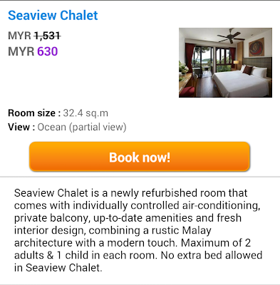 Resort World已住过了,对它还满意~ 只是男友说不要住回一样的了,所以。。。想了很久。。真的很挣扎。。定了Berjaya Langkawi, RM630 Seaview Chalet。对于价钱是有点心痛,可是想到是度蜜月,所以也就算了~