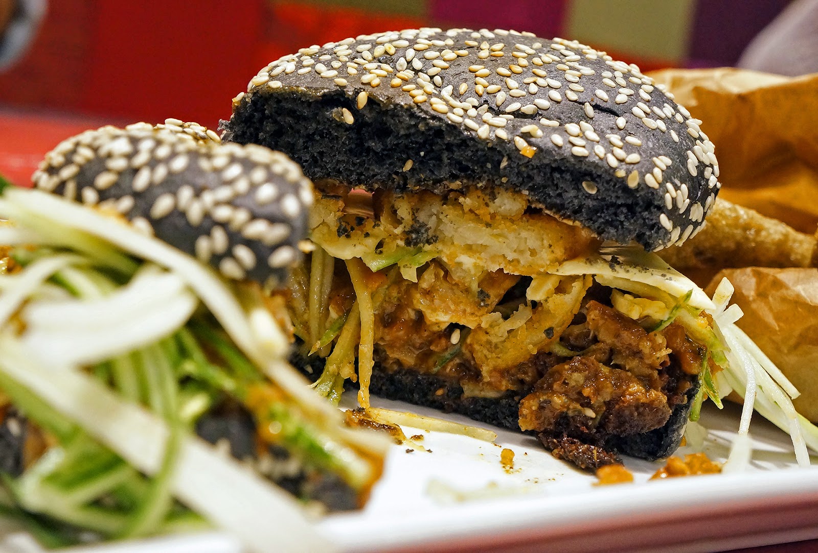 沙爹汉堡用上了颜色鲜明的黑炭面包,面包的口感很松软,外皮烤得脆脆的,非常好吃。