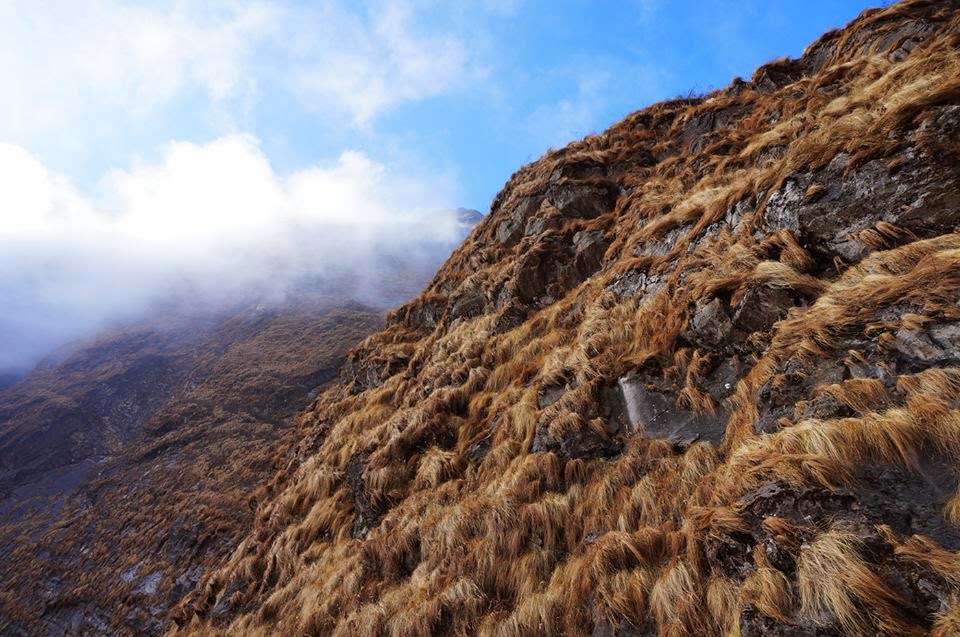 這時候, 我們發現有很厚的云霧再從魚尾峰那里吹著過來! 陽光開始被山和霧阻擋了, 天氣從幾分鐘前陽光暖突變成云霧冷!