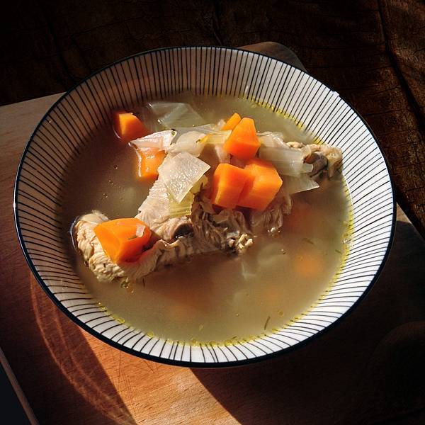 (因为食谱书步骤直接将生鸡骨头和其他食材一起丢进去炖煮,导致食谱书里会提及"当汤面浮出杂质泡沫时以漏勺捞去"我在制作的过程并没有杂质出现)