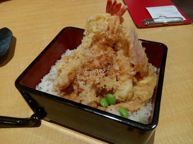 我们点了一个大份的天妇罗盖饭。端上桌的时候,天妇罗摆盘得很漂亮。天妇罗里有虾,番薯和羊角豆,味道 OK。天妇罗虾炸得不是很好,裹上了一层厚厚的面粉。比较让我不满意的是,这天妇罗没有萝卜泥来搭配,味道就好像缺少了一块。