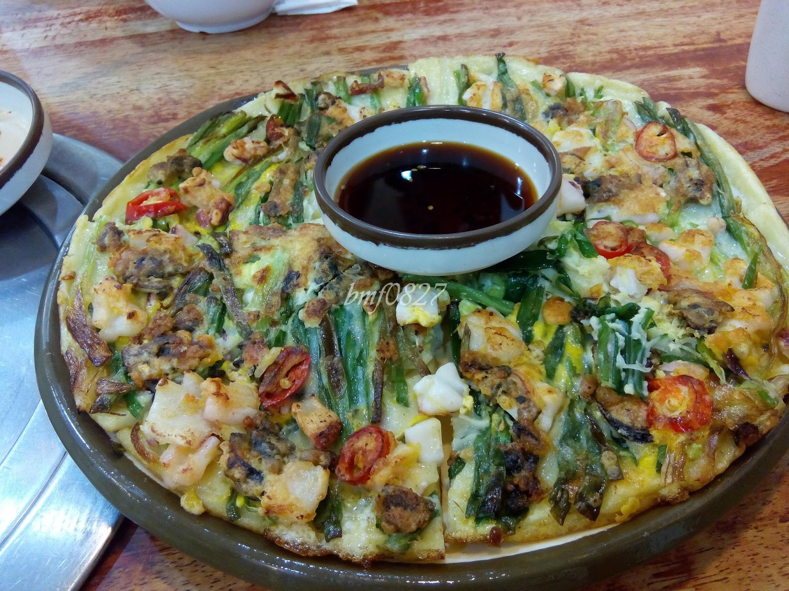 我们还点了海鲜煎饼 (Pajeon)。 一端上桌时,我们都被它惊人的大分量给吓倒了。 厚厚的 Pajeon 上面铺满了青葱,韭菜,章鱼和辣椒片,让人很有饱足感。 特制的酱料提升了 Pajeon 的整体味道,是一道很好的 comfort food。