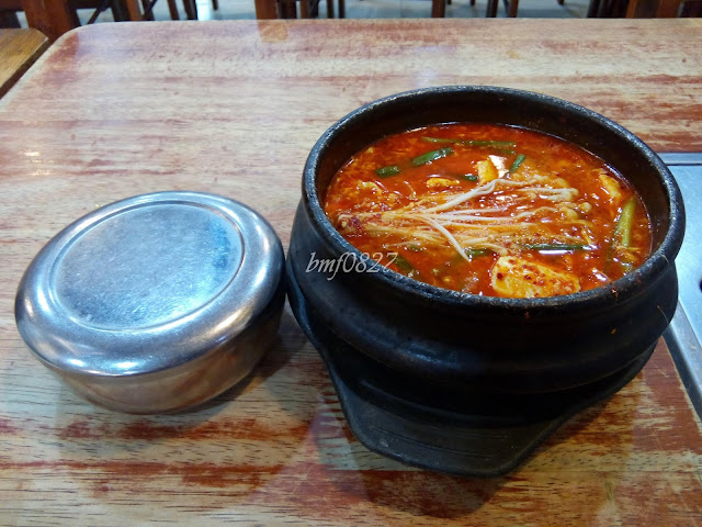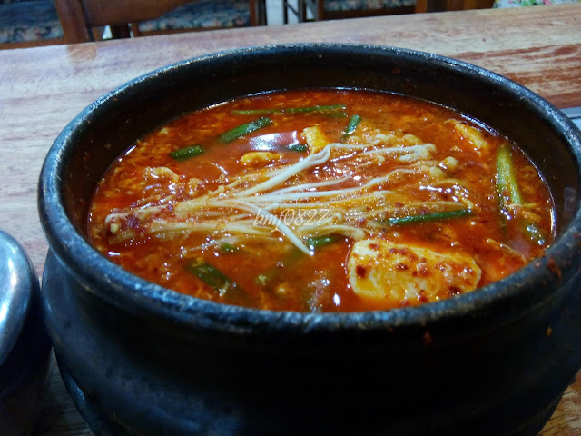 辣豆腐汤,相对于其他的辣酱或料理来说,算是比较辣的一道。 里头的料很多,有虾、蛤蜊、金针菇、豆腐和蔬菜等。 这是本人到韩式料理餐厅比点的一道汤。 够味的汤配上嫩滑的豆腐,和其它丰富的配料,一碗饭很容易就下肚啦~ 店家用的容器可以保持汤的热度,即使吃到最后,汤还是温热的。