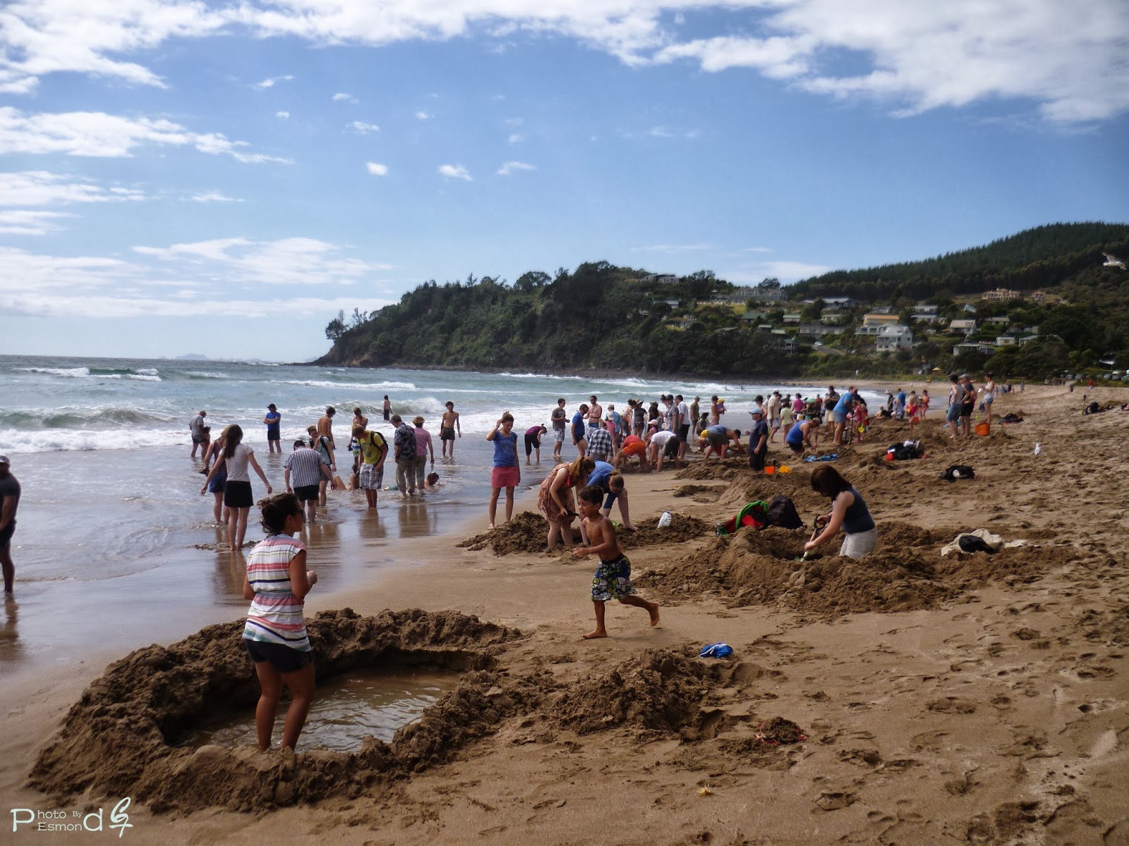 当天大概在最低潮的时候抵达海滩。接下来就是前往指定的地点,选一个风凉水热的地点,等到最低潮时就开始挖。Hot Water Beach不愧为热门的海滩旅游景点,这里可说是人山人海。