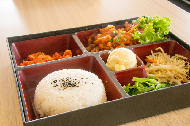 我点了一份辣炒猪肉片便当,分量很大。猪肉片和洋葱一起配上辣酱炒至完全入味,但 肥瘦参半的猪肉片 口感还是脆口的,和软透的洋葱一起吃,很下饭。 便当的小菜除了有泡菜、 芽菜和菠菜外,还有马铃薯泥,带甜的马铃薯泥有很好的解辣功效,中和了韩式料理的辛辣。