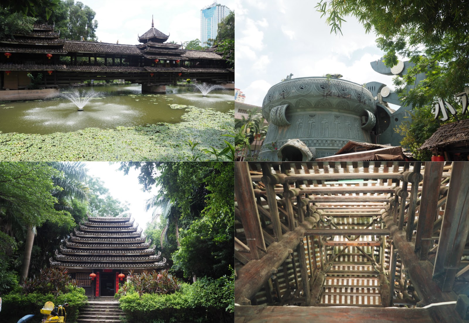 苑內展示了壯族銅鼓和侗族風雨橋和鼓樓等的民居建築,
