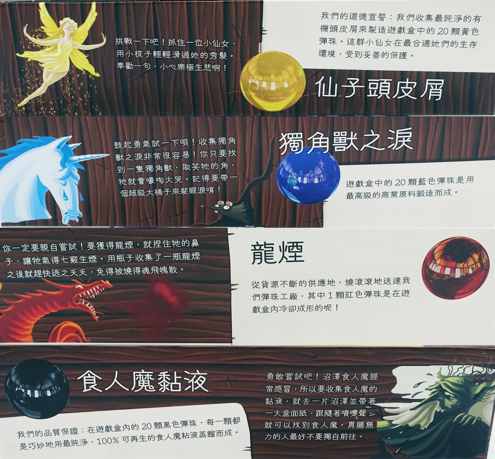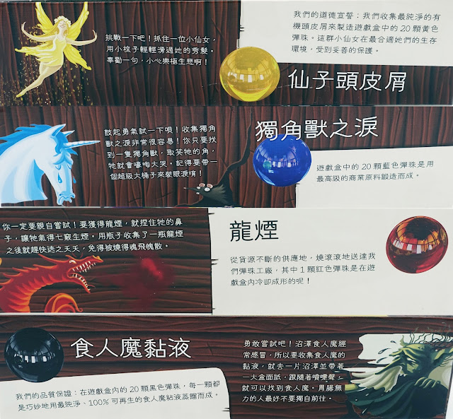 亮點就是內盒的四個盒側,分別用很可愛的方式介紹了四種不同顏色的彈珠代表的是什麼樣的成分,搭配詼諧的插圖,真的超級用心的!讓人迫不及待想馬上來調和它們了!