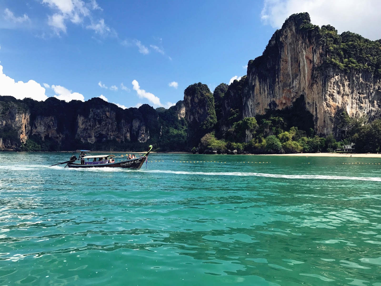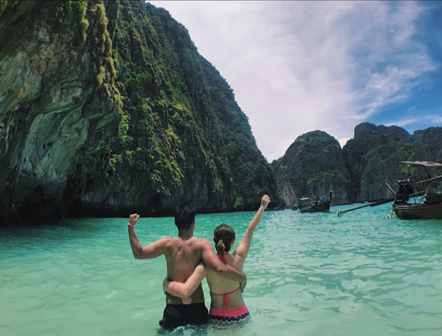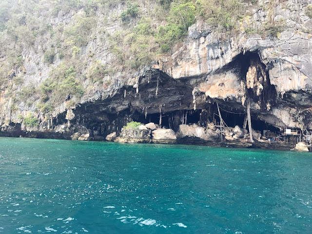 第三天行程- Phi Phi Island 出海可以自由选择speed boat 或者是long tail boat。怕晕船的朋友记得准备好药物随身携带。Long Tail Boat较耗费时间,我们都觉得坐快艇刺激又好玩! 去Phi Phi Island最佳的时间是三月至五月,太阳高挂的季节。谁知道我呆在甲米四天三夜都不停地在下雨。去Phi Phi岛当天跨很大风,一直感觉要下雨,真感谢老天爷撑到旁晚才稀里哗啦地下,不然我们就没办法出海了。导游说过为了保证大家的安全,下雨的话途中的行程就会终止然后回到岸上。 Tham Viking Cave 游艇经过这里的时候会停下让我们瞧一瞧,不开放让游客进入。据说这里曾经是海盗的藏身地。这里是海燕的栖息地,盛产很多燕窝,也被当地人命名为燕窝洞。 Maya Bay Phi Phi Island配套会去好几个景点,当中包括Bamboo Island,Tham Viking Cave,Lohsamah Bay,Monkey Bay和Maya Bay。 Maya Bay最为出名,Leonardo Wihelm Dicaprio 2000年主演的电影《The Beach》就是在Maya Bay 这里取景。《The Beach》大大提高了皮皮岛的知名度。