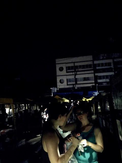 大概四点多抵达码头,Phi Phi Island一日游结束了!回到酒店梳洗完正打算外出前往Krabi Town Night Market ,却下起了倾盆大雨。我们跑进7-11里各别买了一件廉价雨披。披上雨披走到马路上拦Tuk Tuk车,大家已经淋湿了手脚,去夜市的念头依然没有打消。前往甲米镇路途30分钟左右。很庆幸抵达甲米镇的时候,雨已经停了。小贩们陆续出来摆摊子。 话不多说,先医饱肚子。 炸鱼饼,Nutella Banana 煎饼, 炒章鱼蛋....照片上只是其中一部分的食物,忙着吃其他的都忘记拍。奶茶,猪脚饭,烤肉串,章鱼烧烤,泰式糕点统统吃进肚子里。 万万没想到,整个夜市突然停电了。一盏一盏的电话聚光灯亮起,微弱的灯光似乎没有太多帮助。当时我们在饮料档口买着椰水,那么暗的情况下老板仍在砍着椰子,让我们都捏了一把汗,赶快拿聚灯光帮老板打亮。电源恢复过后游客们才继续逛下去,那时候的也是明显可见人潮已逐渐减少了。