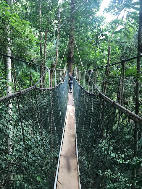 吊桥 Canopy Walkway 吊桥全长530m,离地面45m 高。站在桥上往下看地面都看不见,那一刻心都寒了。 穿越吊桥,每人得征收RM 5费用。 全程有工作人员在转接处协助控制人数,以确保吊桥不会过度拥挤,所以游客们都得排队耐心等待。 吊桥从2/3/18起因维修工程而暂时关闭,开放时间请自行到官方网站查询。 夜间探险 晚间导游带我们进入森林里探察动物们各自的栖息地,导游的带领下我们发现了不少躲藏起来的昆虫,比如竹节虫,蜘蛛,萤火虫,蝎子甚至鸟类。没有导游的协助下晚间要看见动物的行踪非常吃力。森林里有座动物观望台,观望台前方有个天然盐湖,导游说幸运的话可以看见马来膜,山猪,大象或野鹿等等的野生动物出没。游客还可以留夜观察动物的一举一动。野生动物通常在夜色暗沉的时刻野生动物才会出没,可惜咱们当天月亮高挂,能看见动物的机率是零。 我入住的第二晚听其他房客说野猪晚上从森林里跑了出来!  瀑布 Lata Berkoh water fall 从大汉河乘船到瀑布,乘船的过程中别忘了静下心观赏河流两旁的如画般的风景。这河水的颜色像黄泥的土色,手渗透进河里可是非常地清澈,那是自然的颜色而且河水冰冰凉凉,跳下水非常凉快。 瀑布的急流汹涌,下水之前建议先问船夫是否适合。尚若当天下起了雨,河流水位也会随着上涨,建议别下水为妙。 急流冲浪 repid shooting 船夫左右摇晃船只河水打在我们的身上全身湿透,原来坐在小船上冲浪那么刺激好玩!大家还互相开起了泼水大战,也帮船夫一把让船上的所有人都湿身。之后船夫也把船停在岸边让我们可以下水游泳。我们落魄的样子就没法子让你看啦,船夫一开始就叮咛我们把贵重物品都放进他准备好的防水包里。 拜访原住民部落 Visit Orang Asli  Batek Negrito 是目前住在森林里的土著,由于他们一直不断地搬迁住所,目前也没有办法估计出他们的人口数量。以前他们靠着打猎,摘蜂蜜为生。后来为了让大家多了解他们的习俗,当地人和原住民做了物物交换。也就是说原住民用示范的方式来教导游客如何生火,用吹管打猎等,然后当地人提供一些生活必需品让原住民维持生活。 早晨导游的带领下,我们步行在森林里参观四周的花草树木,为我们讲解这些树木的用处。有很多可是我们没见过的稀奇植物和菌类。