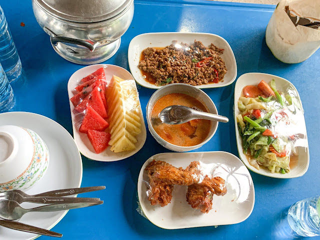 配套里包含午餐,咱们的午餐是岛上居民烹饪的泰式佳肴,两人分为一桌。三菜一汤加水果一份,还蛮丰盛。饭一桶任你吃多少都可以,此外还附上一瓶矿泉水。旅客不能携带任何食物和饮料进入岛上。岛上有当地人经营的小酒吧和贩卖部。想喝汽水椰水都行,自付。